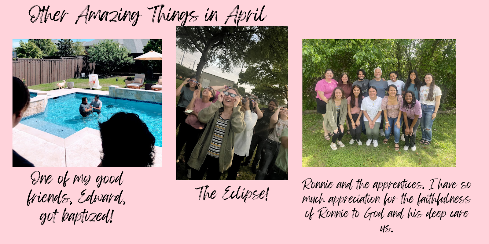 - Lastly, as May approaches, please be praying for our ministers as we begin raising support for next year. Campus ministry truly takes a village to happen and your partnership has been evidence of that - thank you!